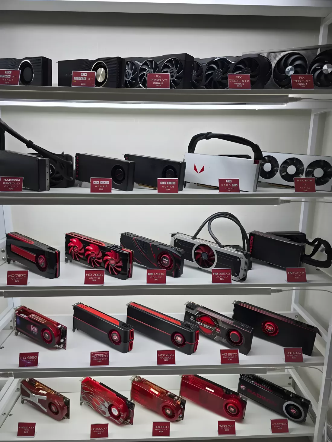 AMD 阵营的收藏则从 2000 年的 Radeon DDR 显卡开始,一直延续到最新的 Radeon RX 9070 XT。收藏中包含多个 AMD 显卡发展史上的关键转折点: